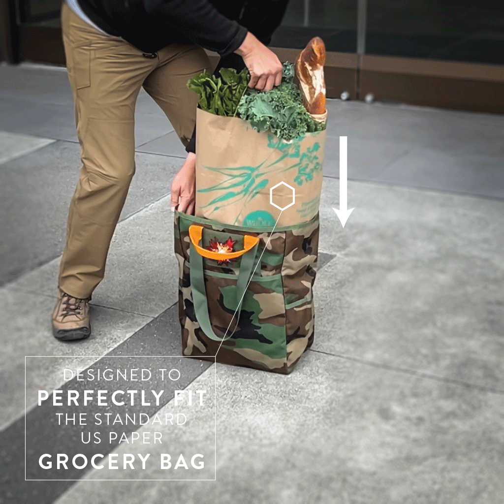 The interior is dimensionally matched to a standard US paper grocery bag. Drop the paper bag inside for stability, or skip the paper bag entirely and load direct. The CaB-2 holds its shape whether full or empty.