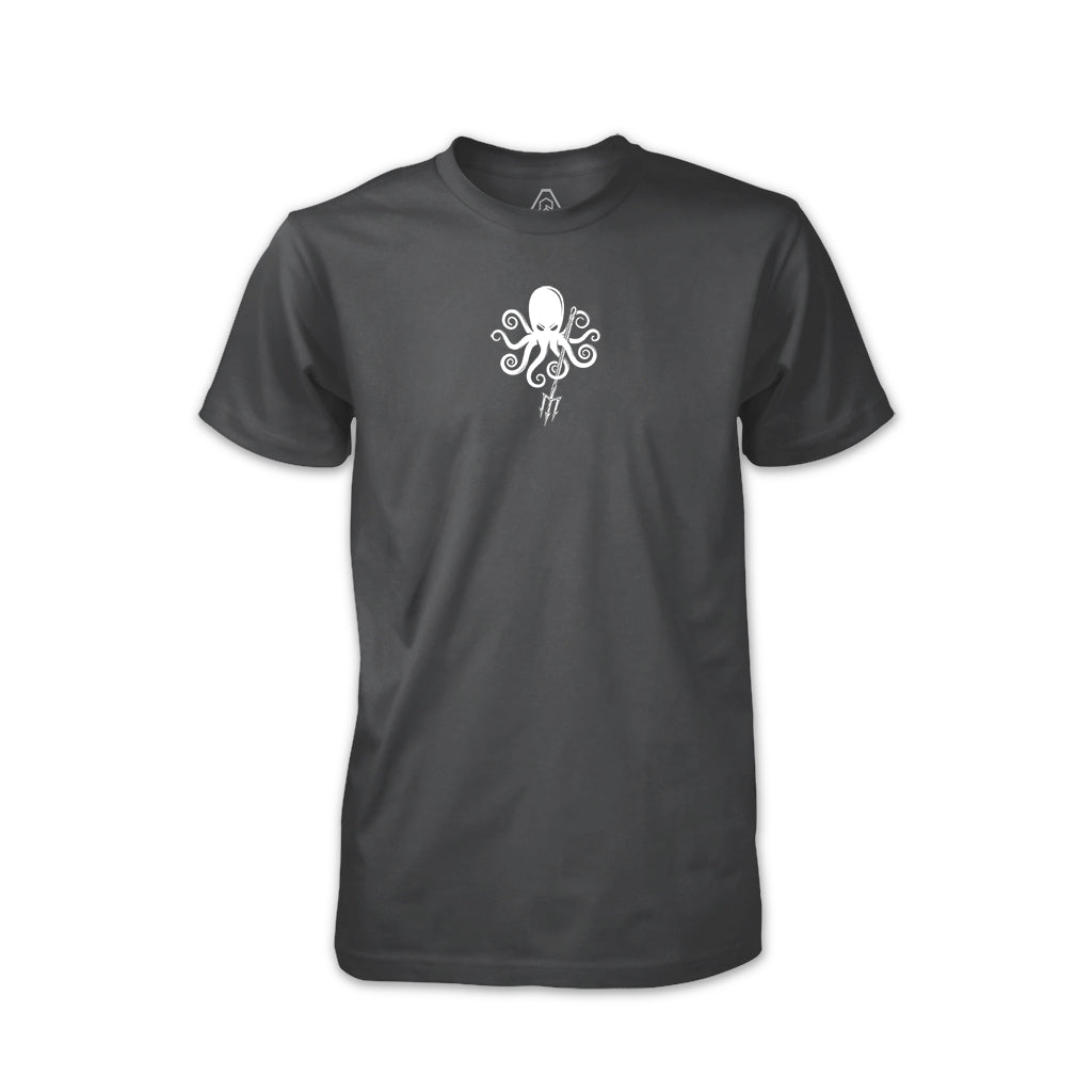 Our now iconic Special Projects Division Kraken Trident Logo in a white (day) and glow-in-the-dark (night) water based graphic on 100% ring spun tee in heavy metal (gray).